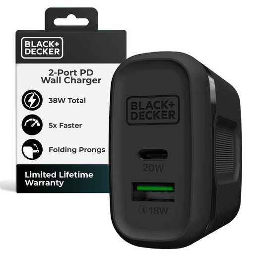 BLACK+DECKER 38W PD Wall Charger – Dual Port USB-C & USB Fast Charging Block
