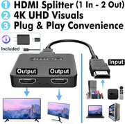 Cyberguys HDMI Splitter 1 in 2 Out – 4K HDMI Hub 2.0 Video Duplicator with Power Cable