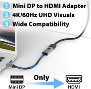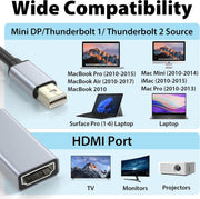 - Mini DP to HDMI Adapter – Effortlessly connect laptops and desktops with Mini DisplayPort or Thunderbolt 1/2 to HDMI-equipped TVs, monitors, or projectors. Note: HDMI cable not included.