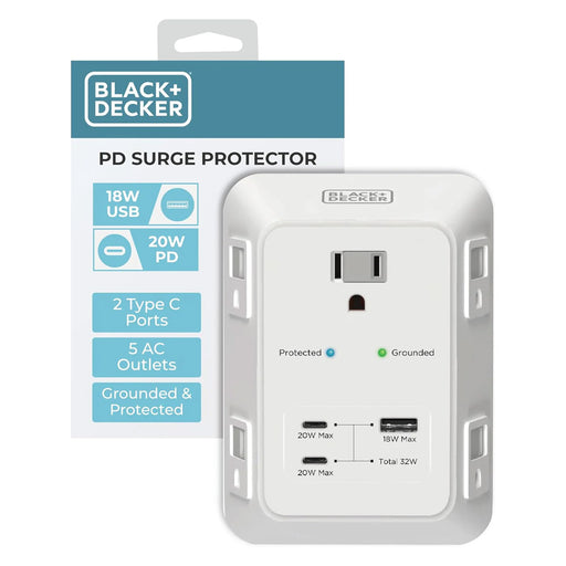 View full detailsBLACK+DECKER 5-Outlet Surge Protector Wall Charger โ 2 USB-C PD & USB-A Fast Charging Ports