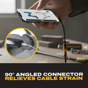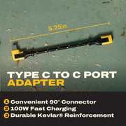 The DEWALT 90° Angled USBC Extension Cable Adapter (100W PD) combines durability and convenience in one essential accessory. With Power Delivery up to 100W, the USB C extender fast-charges laptops, tablets, and smartphones while maintaining high-speed data transfer. The angled design reduces cable stress and fits easily into tight spaces, making it ideal for desks, gaming setups, or mobile work. Reinforced with Kevlar fiber and premium strain relief, this rugged USB-C extension is built to withstand daily wear and tear. Compact and portable, it’s perfect for home, office, or travel.